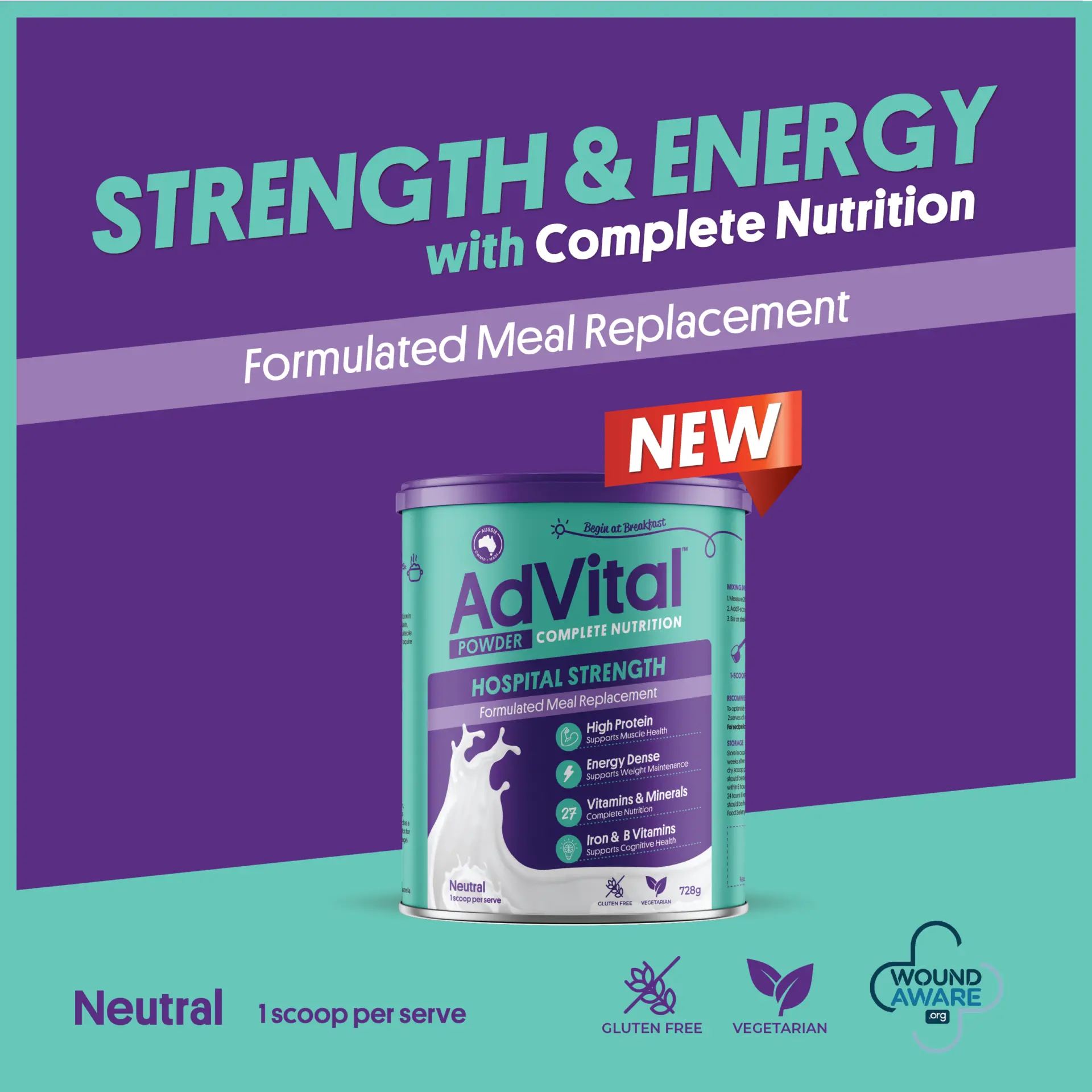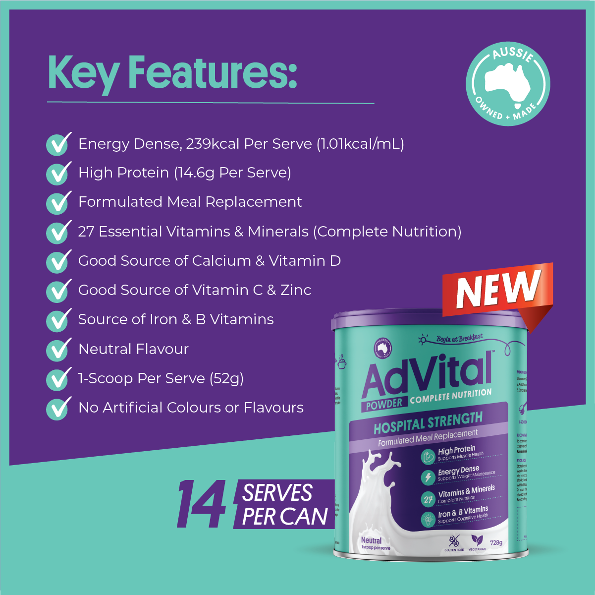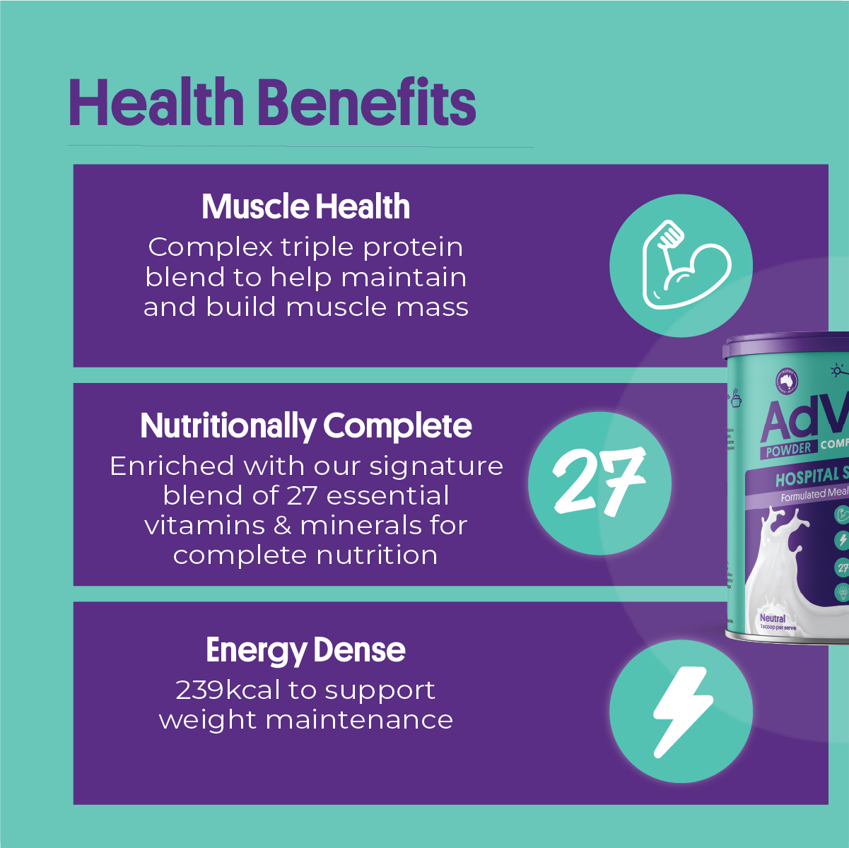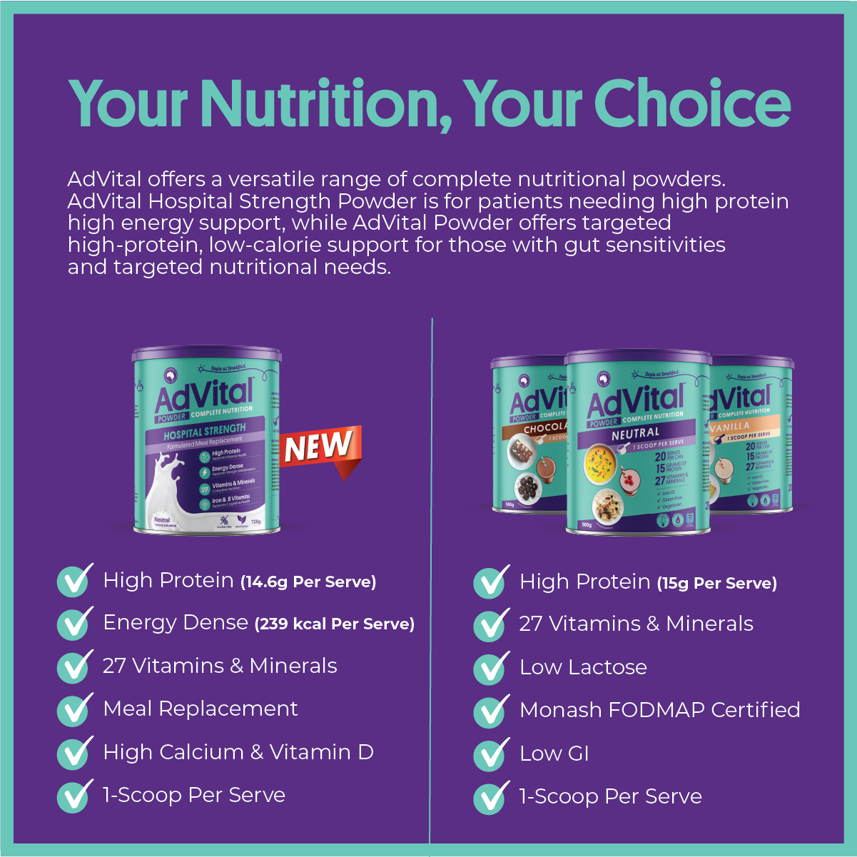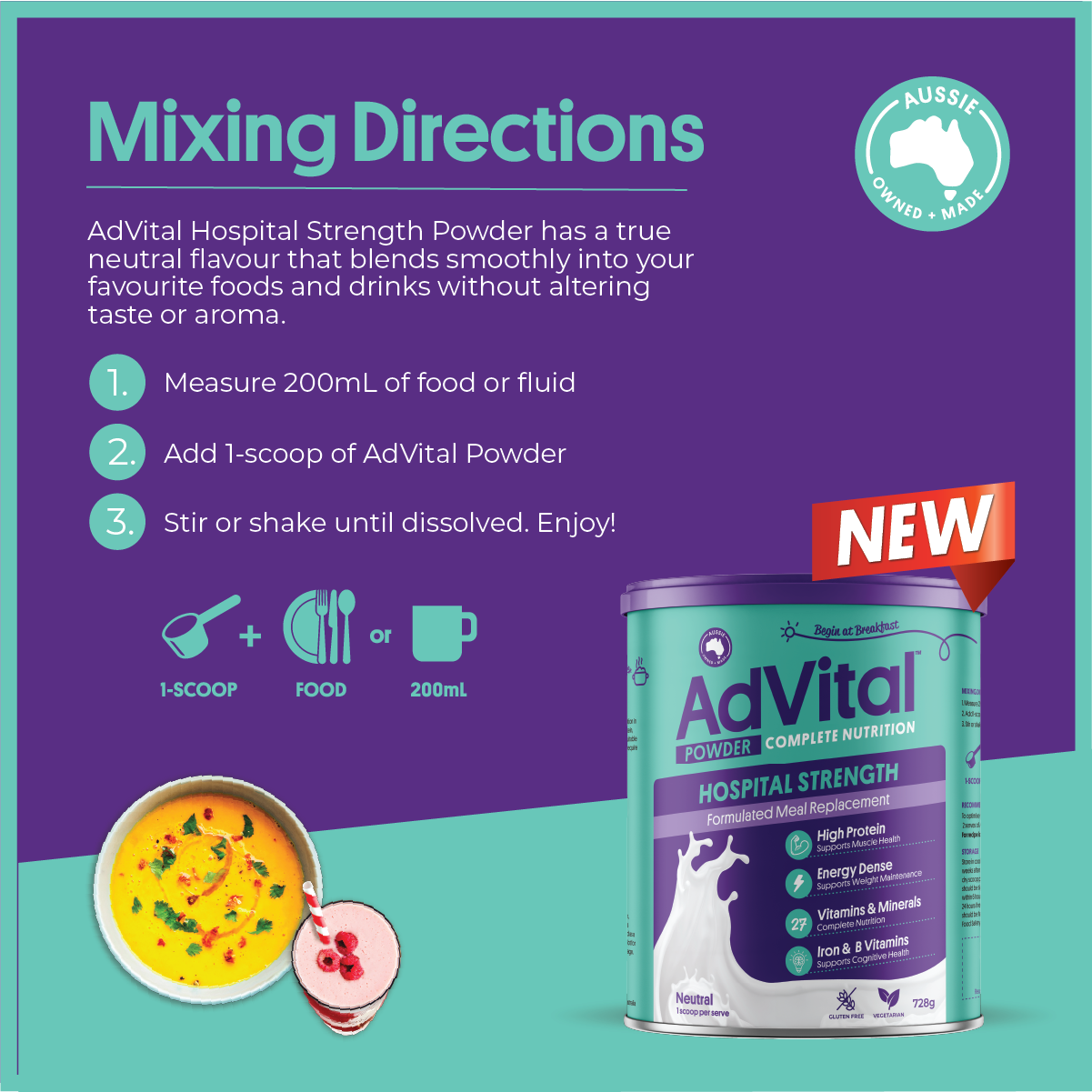 Proudly Australian-owned and made, AdVital Hospital Strength Neutral Powder can be easily mixed into your favourite meals, snacks, or drinks!