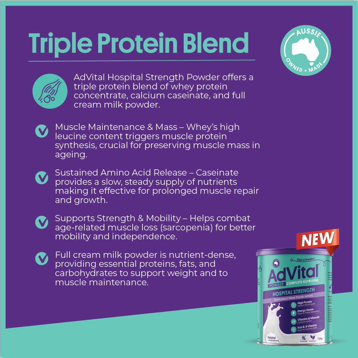 AdVital Hospital Strength Powder offers a triple protein blend of whey protein concentrate, calcium caseinate, and full cream milk powder.
