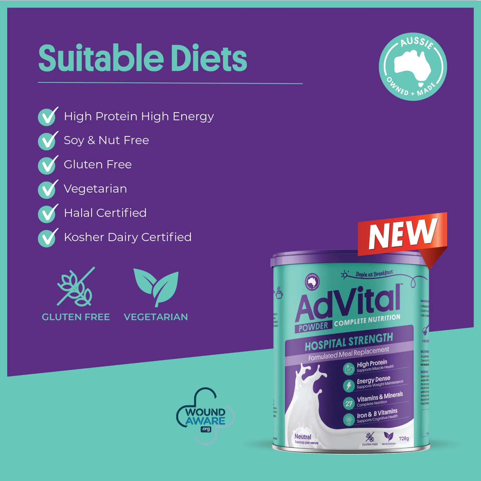AdVital Hospital Strength Powder proudly displays the “Be Wound Aware” logo as part of our commitment to supporting individuals at risk of developing pressure injuries, foot ulcers and venous leg ulcers—particularly those who are malnourished or at risk of malnutrition.