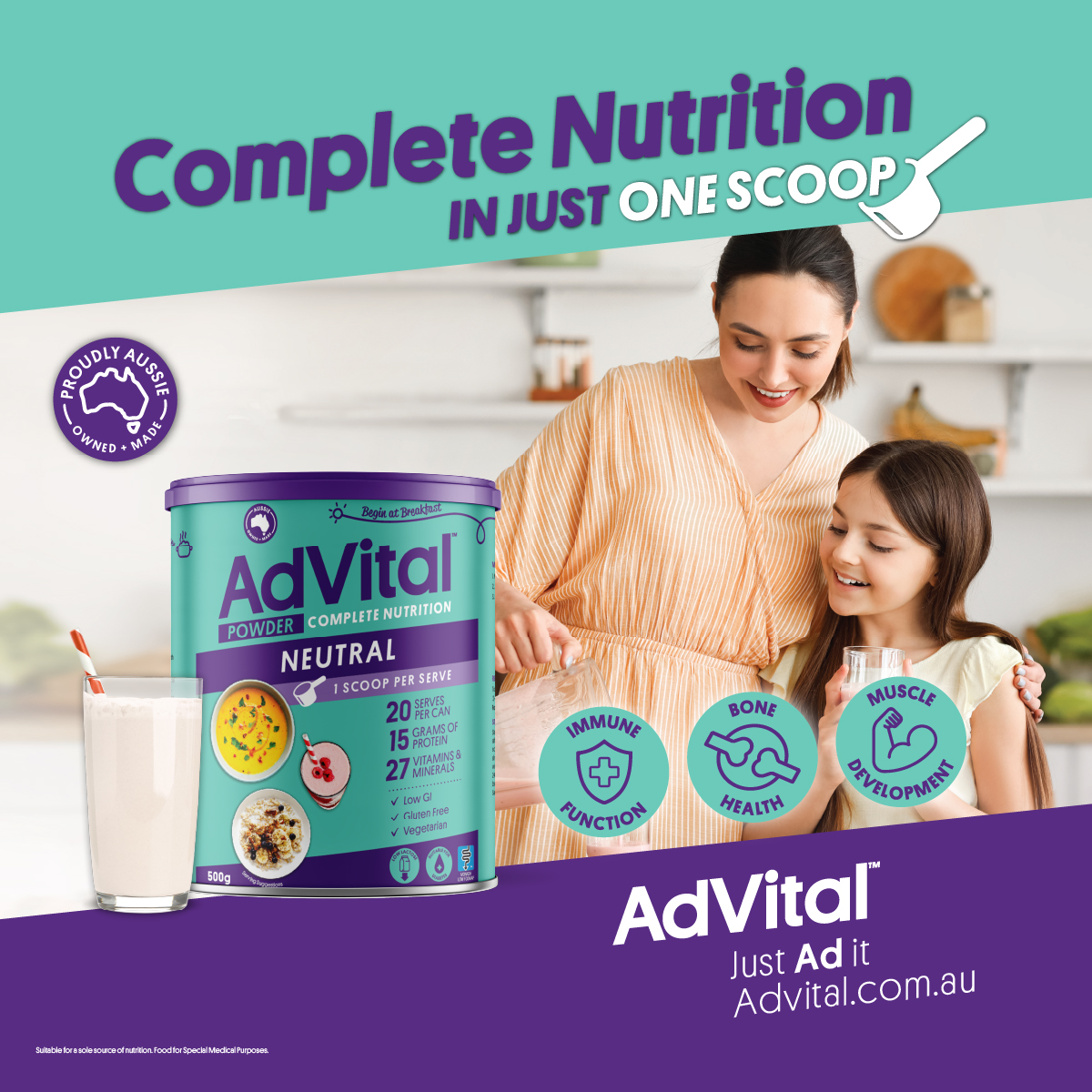 Loaded with 27 vitamins and minerals & 15g of protein, AdVital Neutral Powder is complete nutrition in just one scoop. Proudly Australian-owned and made, add AdVital Powder to meals, snacks and drinks to support muscle health, immune function and bone health.